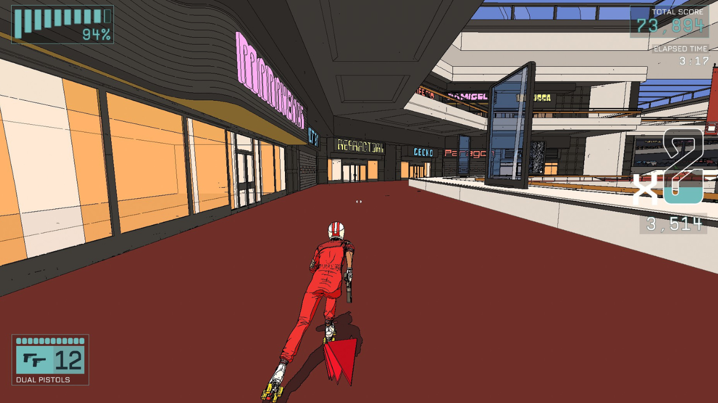 When I say gore, I don't mean heads exploding and blood and guts. There are some bloody particle effects, but Rollerdrome's comic-like design takes away from the "killing".